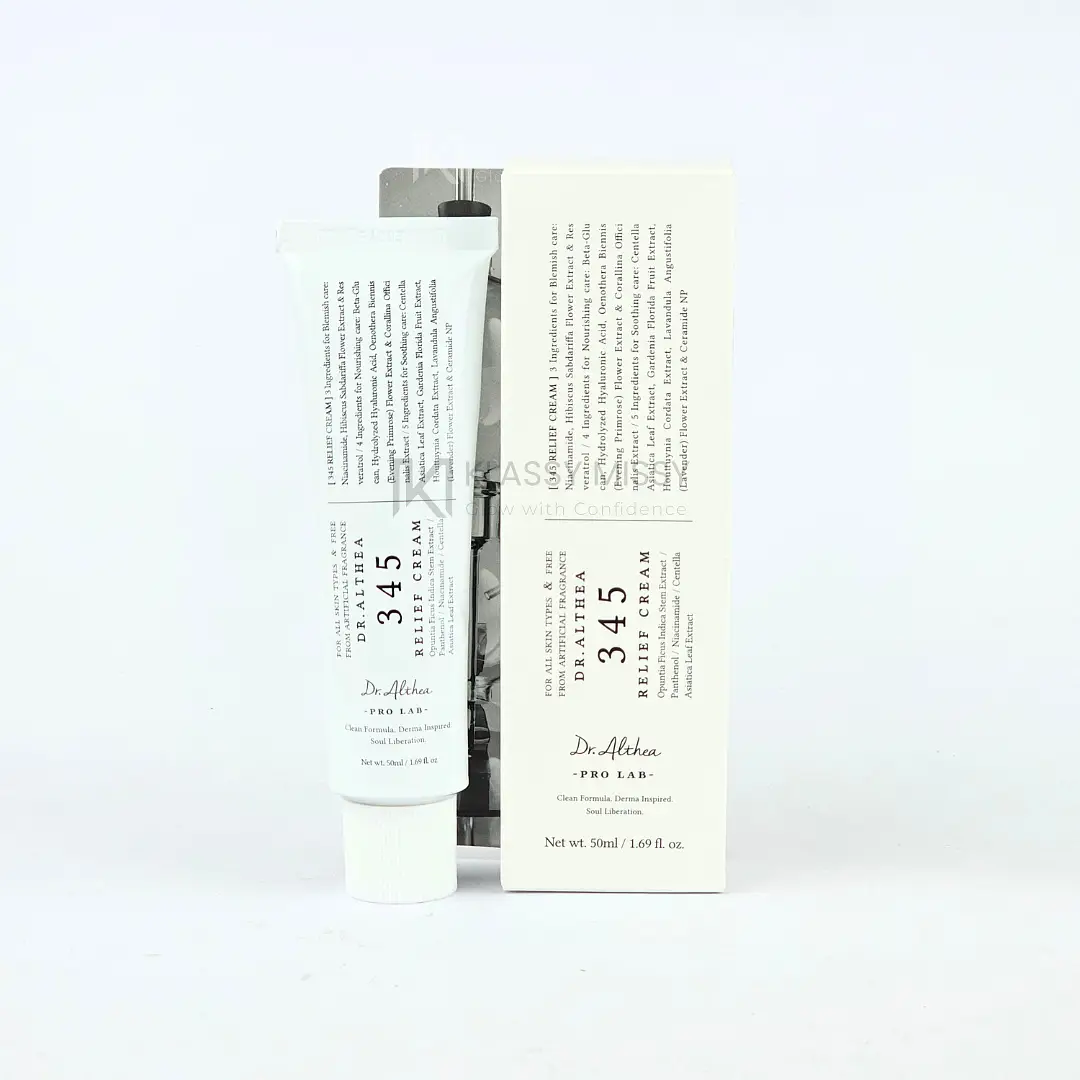 Dr. Althea 345 Relief Cream (50ml) is a calming and hydrating cream designed to soothe irritated, sensitive, or dry skin. Enriched with skin-repairing ingredients, it restores moisture, reduces redness, and strengthens the skin barrier for smooth, healthy skin.